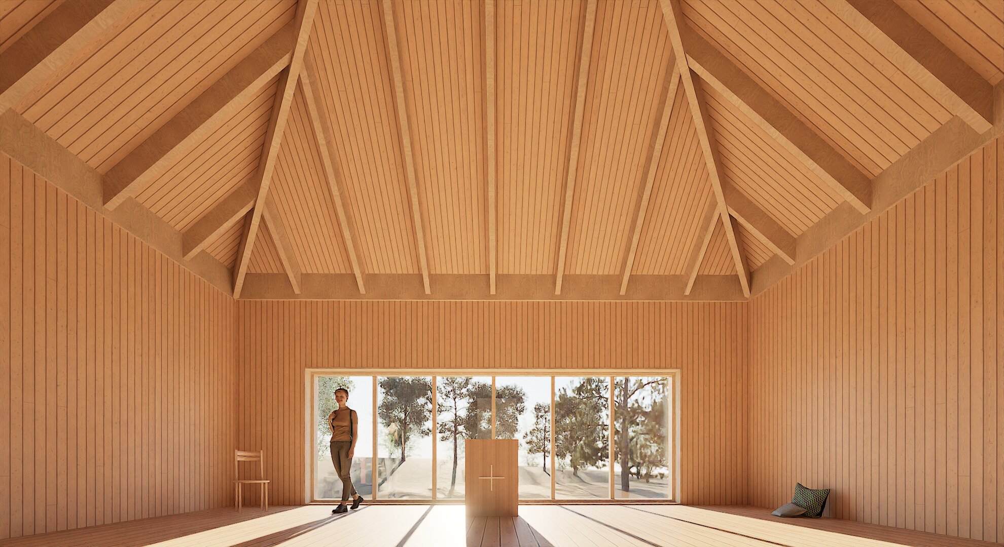The ensemble consists of a chapel, guest rooms, and a separate sauna building. Together, the buildings form a meditative whole, where the daily movement between them becomes as important as the spaces themselves. Nature and the surrounding views also play an essential role in the spatial experience.