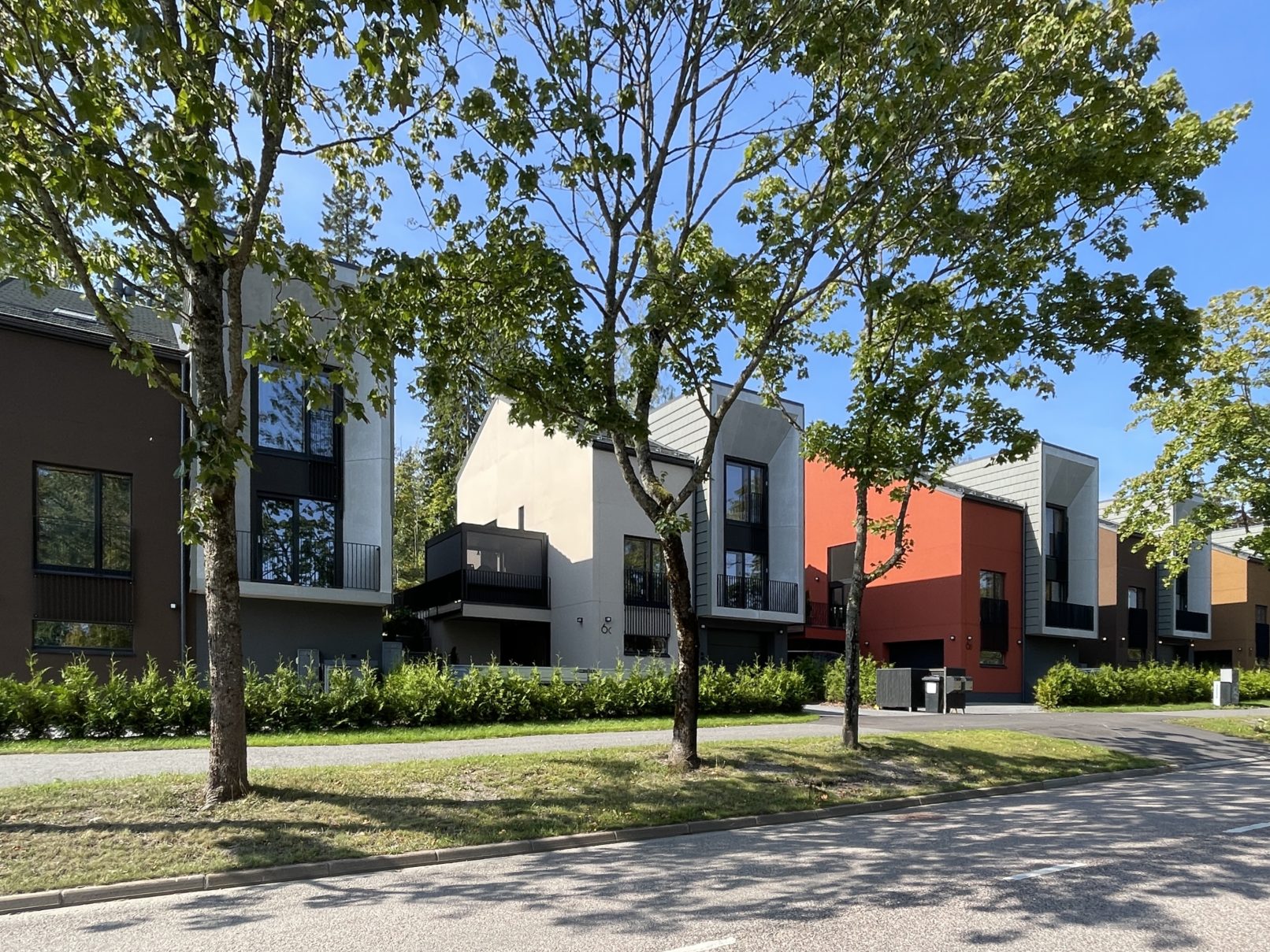 Five urban villas on a sloping site next to a forest. The design is inspired by traditional European townhouse-typologies with a modern twist. The terraces open towards the forest providing a peaceful place in a dense urban context.