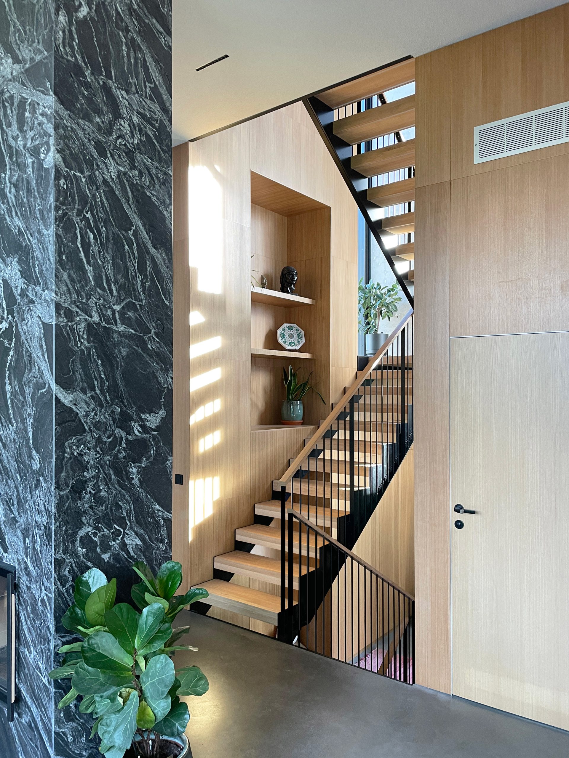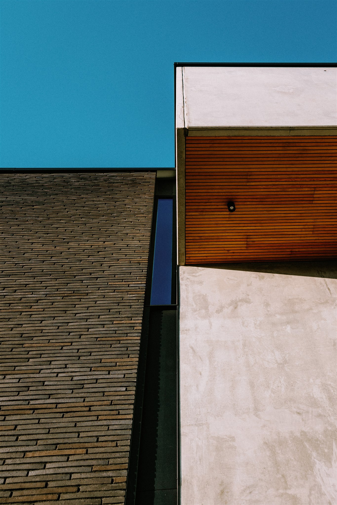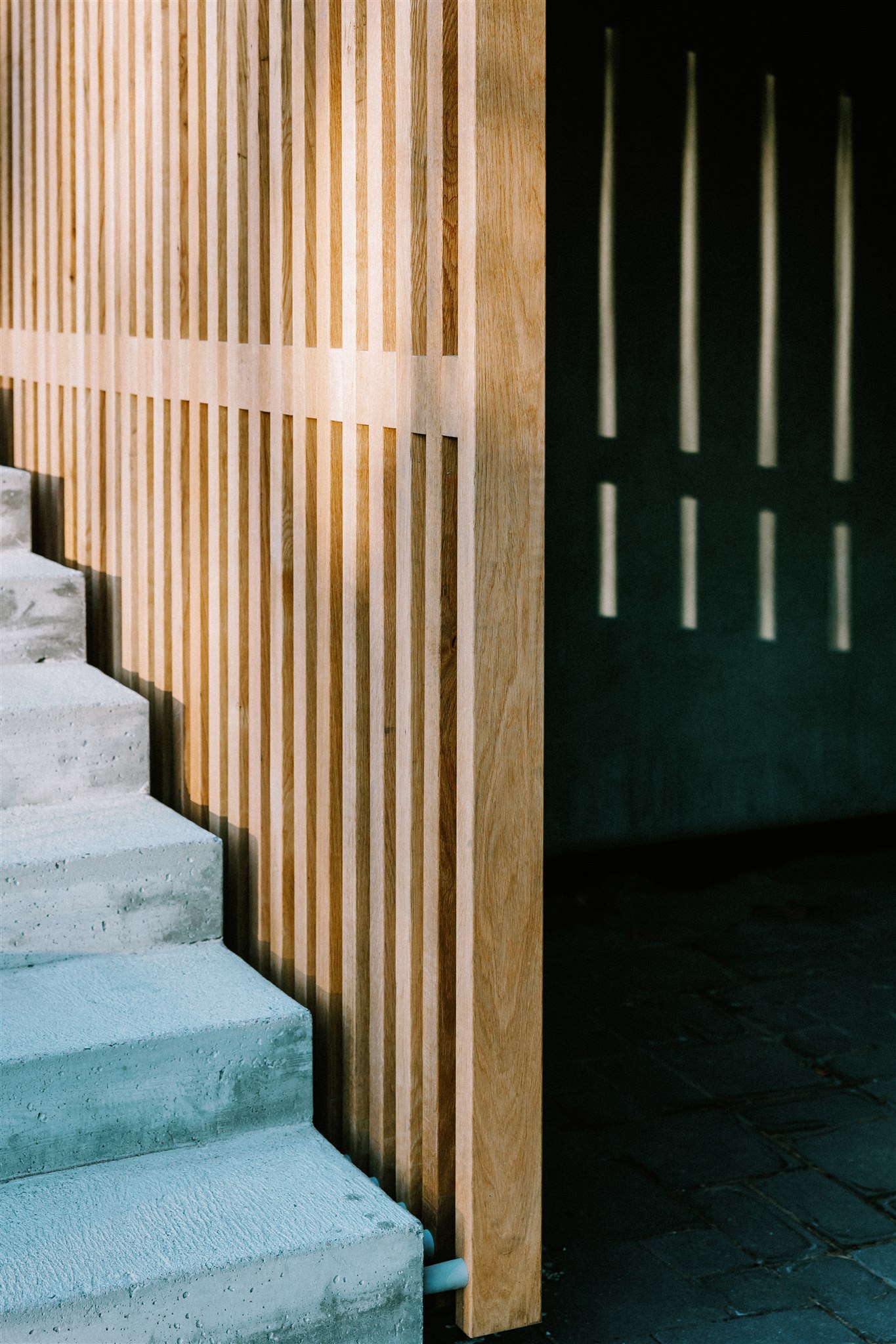 The facade is a layered interplay of textures and natural elements, featuring oak wood, long format bricks, and exposed concrete. These materials, chosen for their timelessness and durability, create a tactile experience that evolves with time and weather. The oak cladding introduces warmth and rhythm to the structure, while the hand-laid bricks provide a crafted, monolithic solidity. Exposed concrete, left raw in certain areas, grounds the architecture with a sense of permanence and strength.
