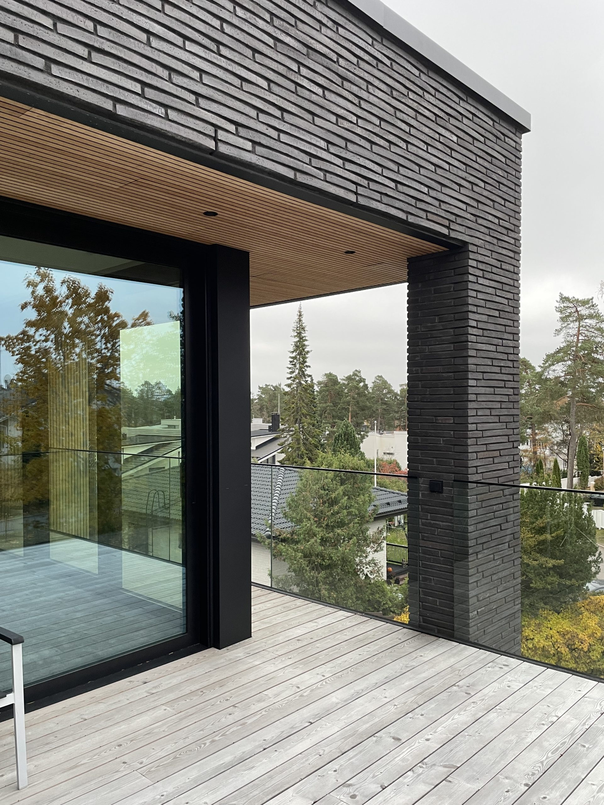 Korkealle sijoitettu terassi laajentaa oleskelutiloja ulospäin, ja lasikaiteet takaavat esteettömän yhteyden ympäröivään maisemaan. Sisätiloissa kaksikerroksiset tilat ja pystysuuntaiset avoimet tilat tehostavat luonnonvalon kulkua, kun taas huolellisesti sijoitetut aukot kehystävät tarkoin valittuja näkymiä ympäristöön.