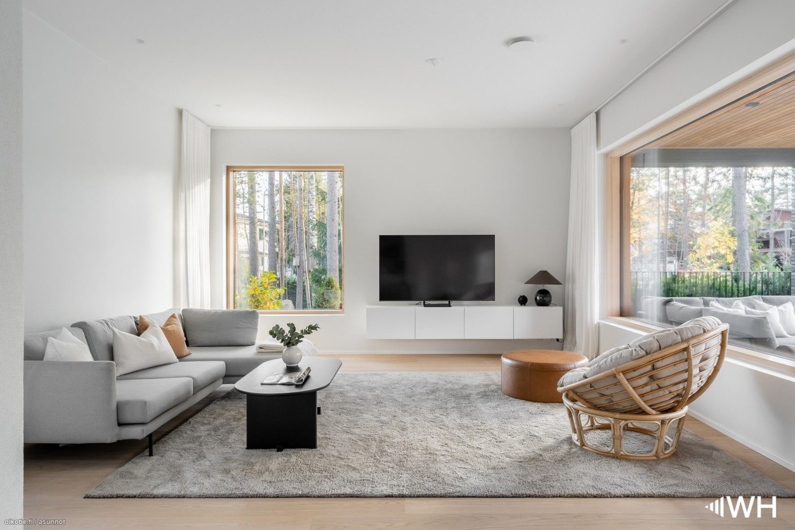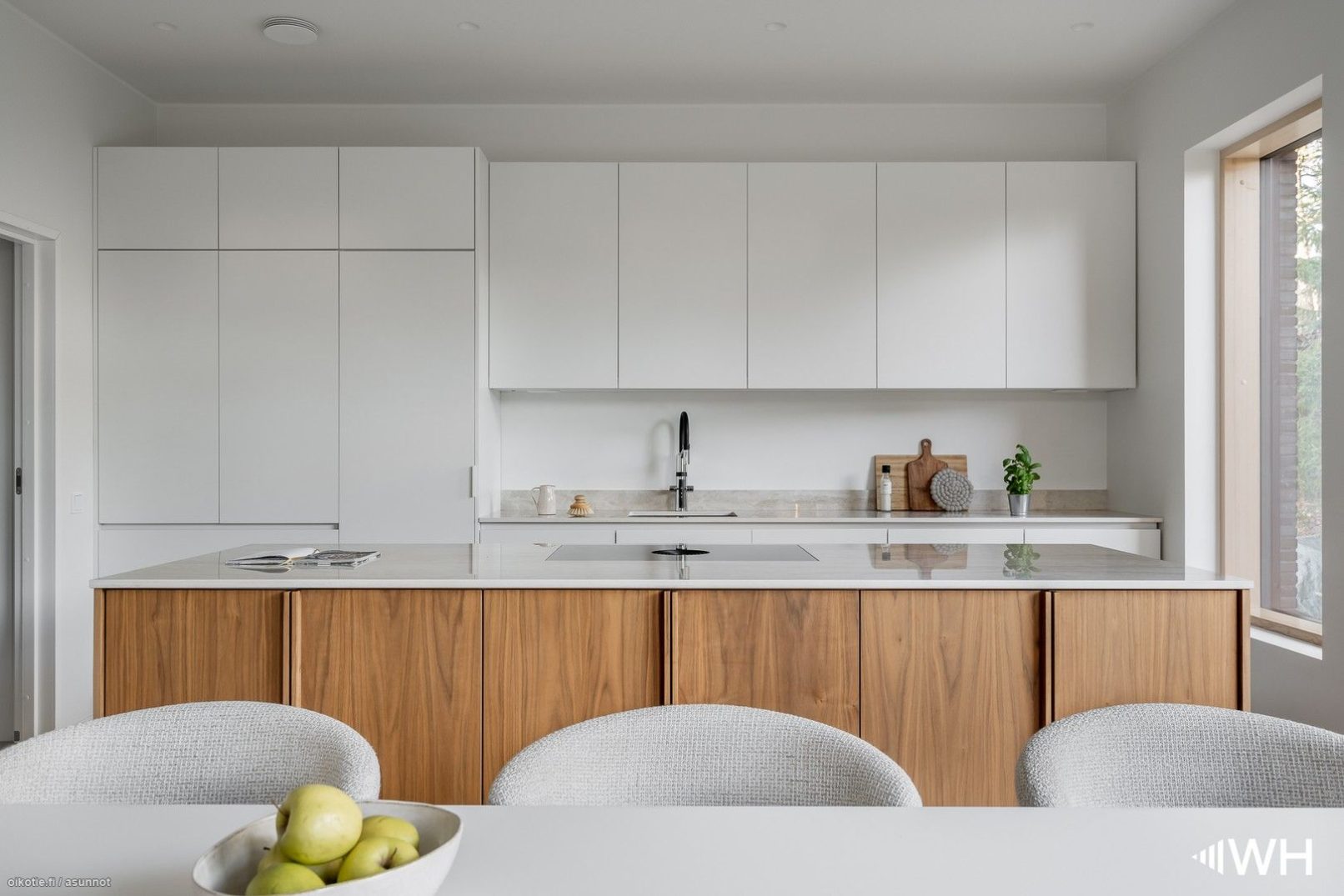 Kauniaislaiselle tontille haluttiin moderni, ajaton talo, jonka juuret ovat suomalaisessa arkkitehtuurissa 60-luvulta. Ulkopuolella on käytetty tummaa tanskalaista tiiltä sekä öljyttyä lehtikuusia, joka luo kontrasteja ja tekee julkisivusta eloisan.