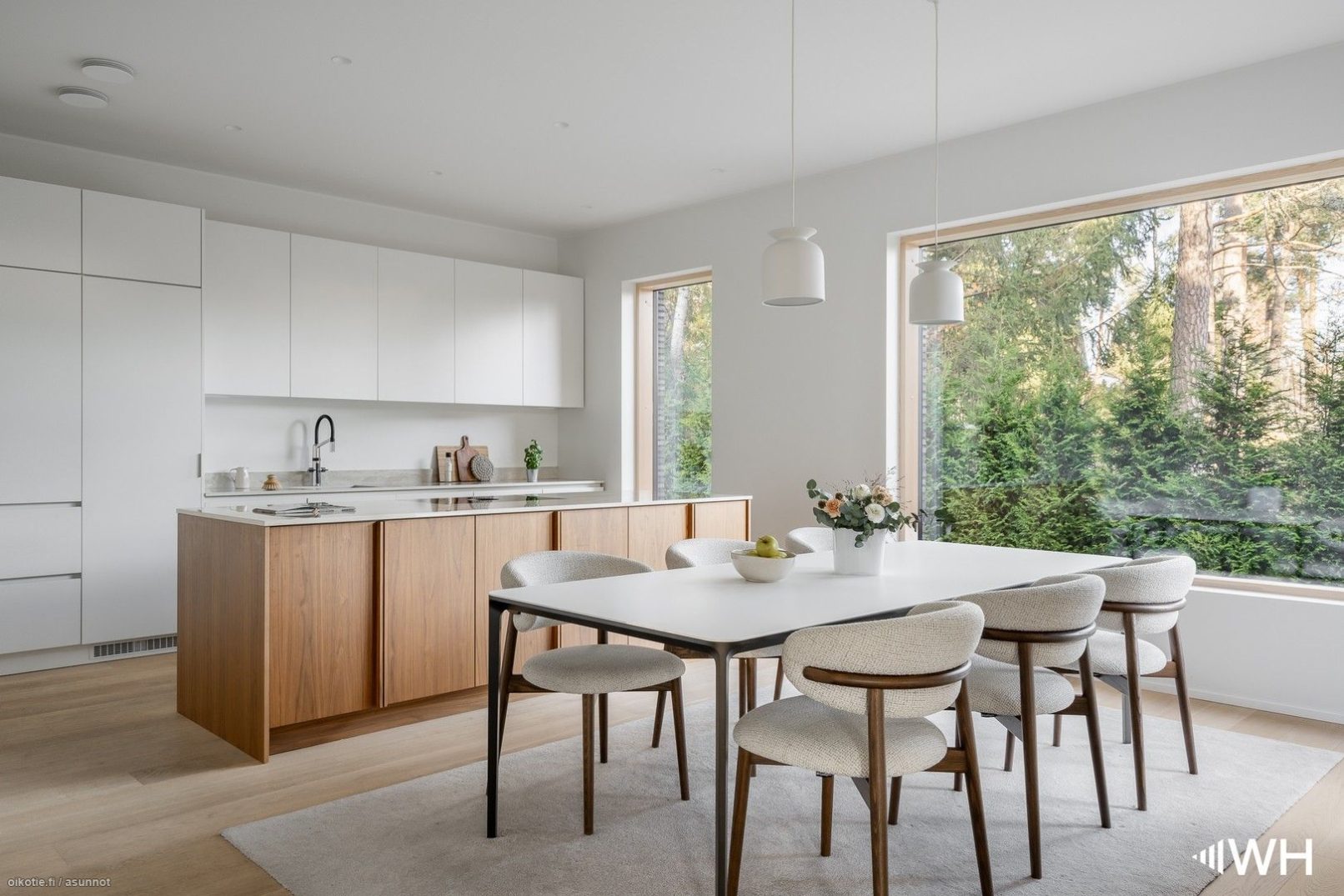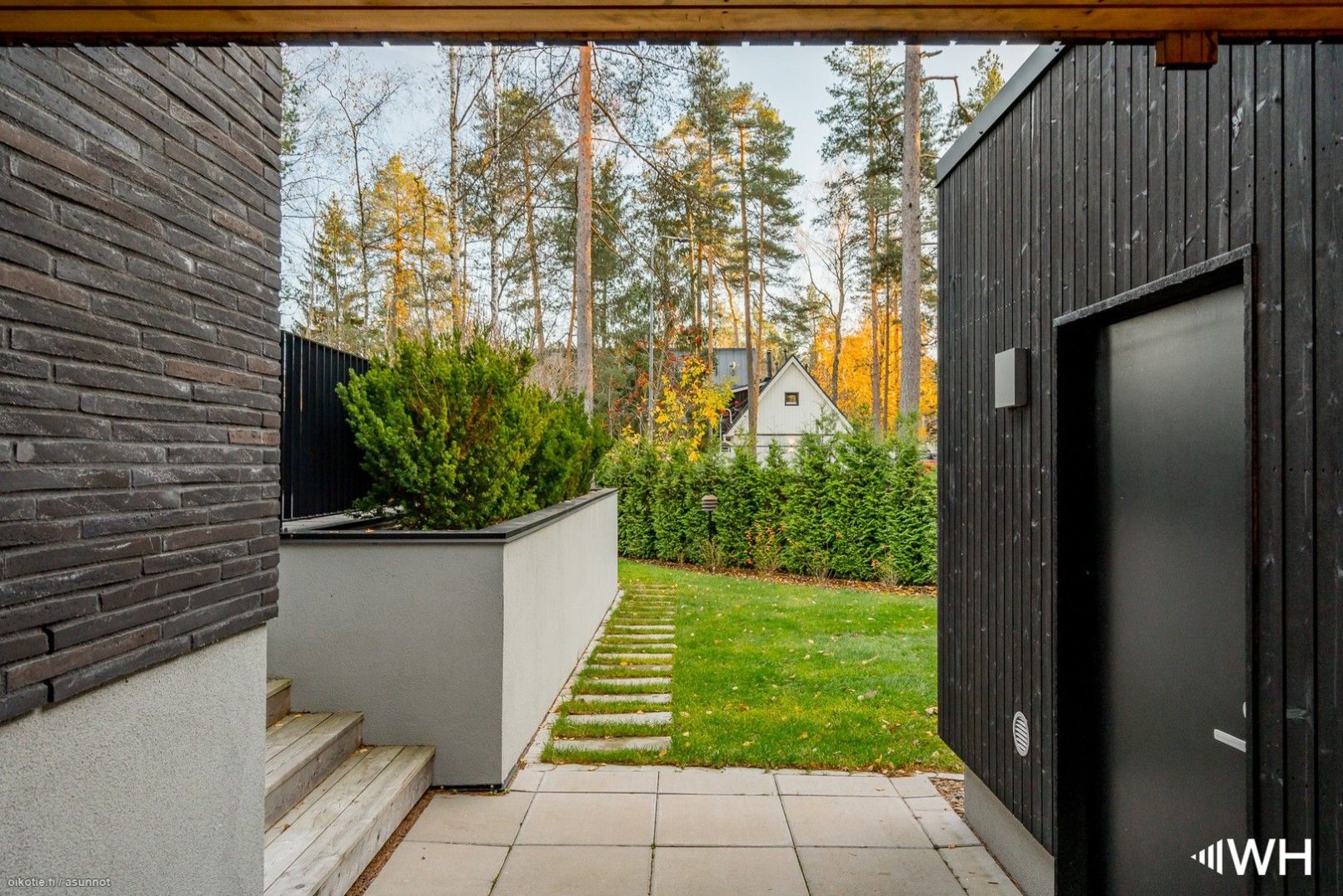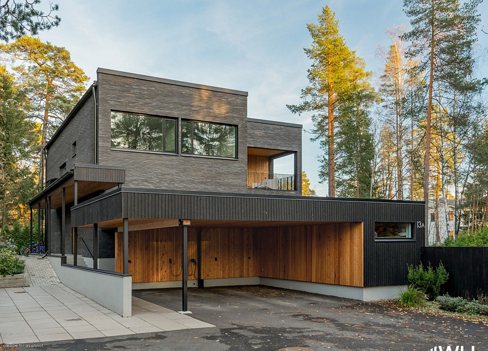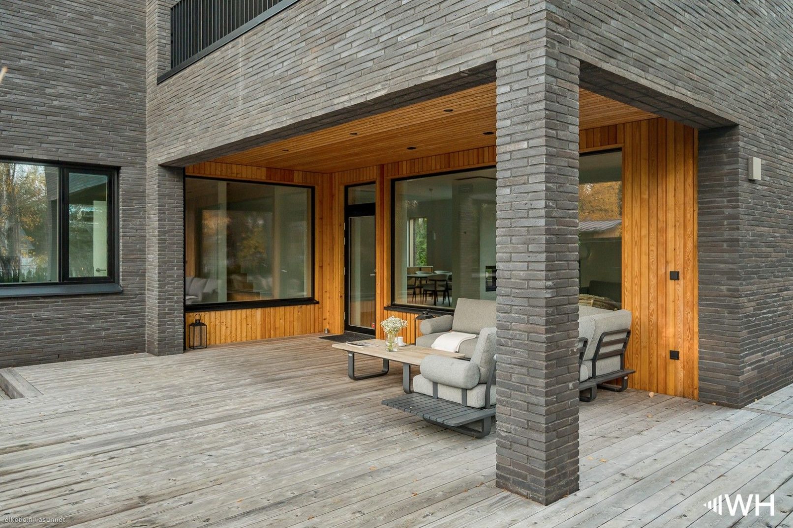 On a plot in Grankulla, we were commissioned to plan a modern, timeless villa with roots in Finnish architecture from the 60s. On the outside, dark Danish brick has been used, as well as oiled larch wood, which creates contrasts and makes the façade come alive.