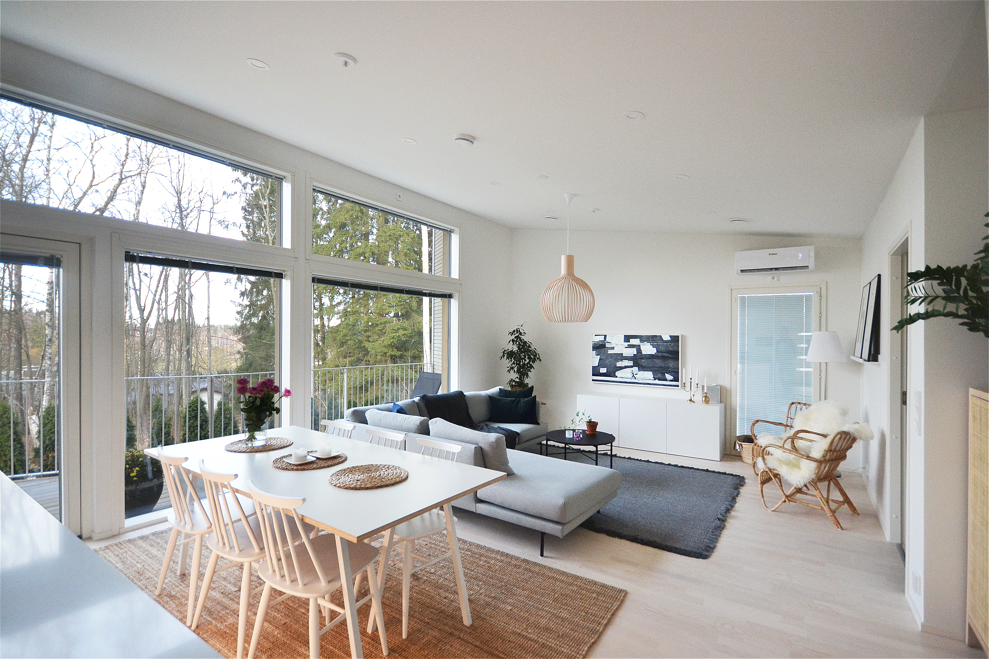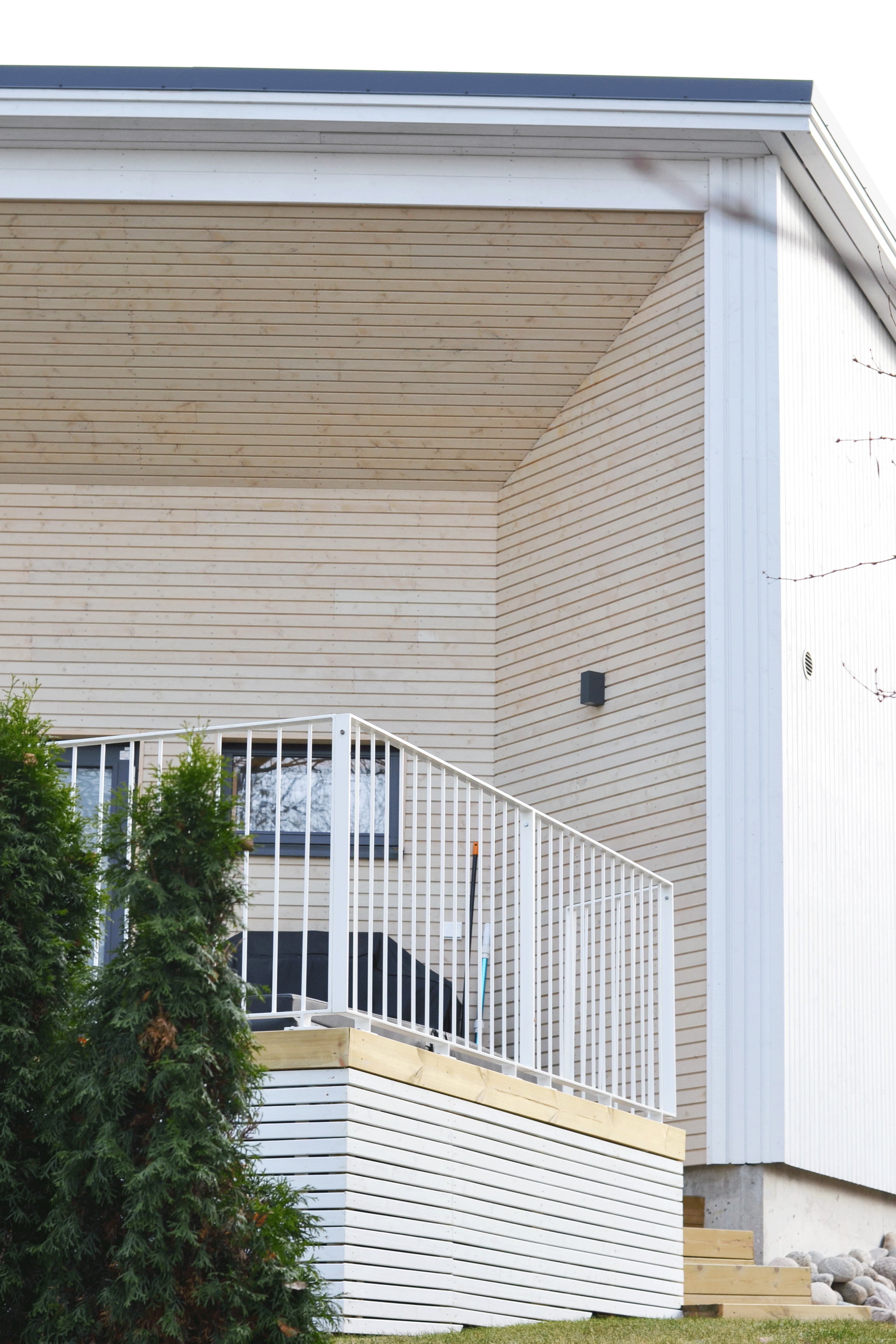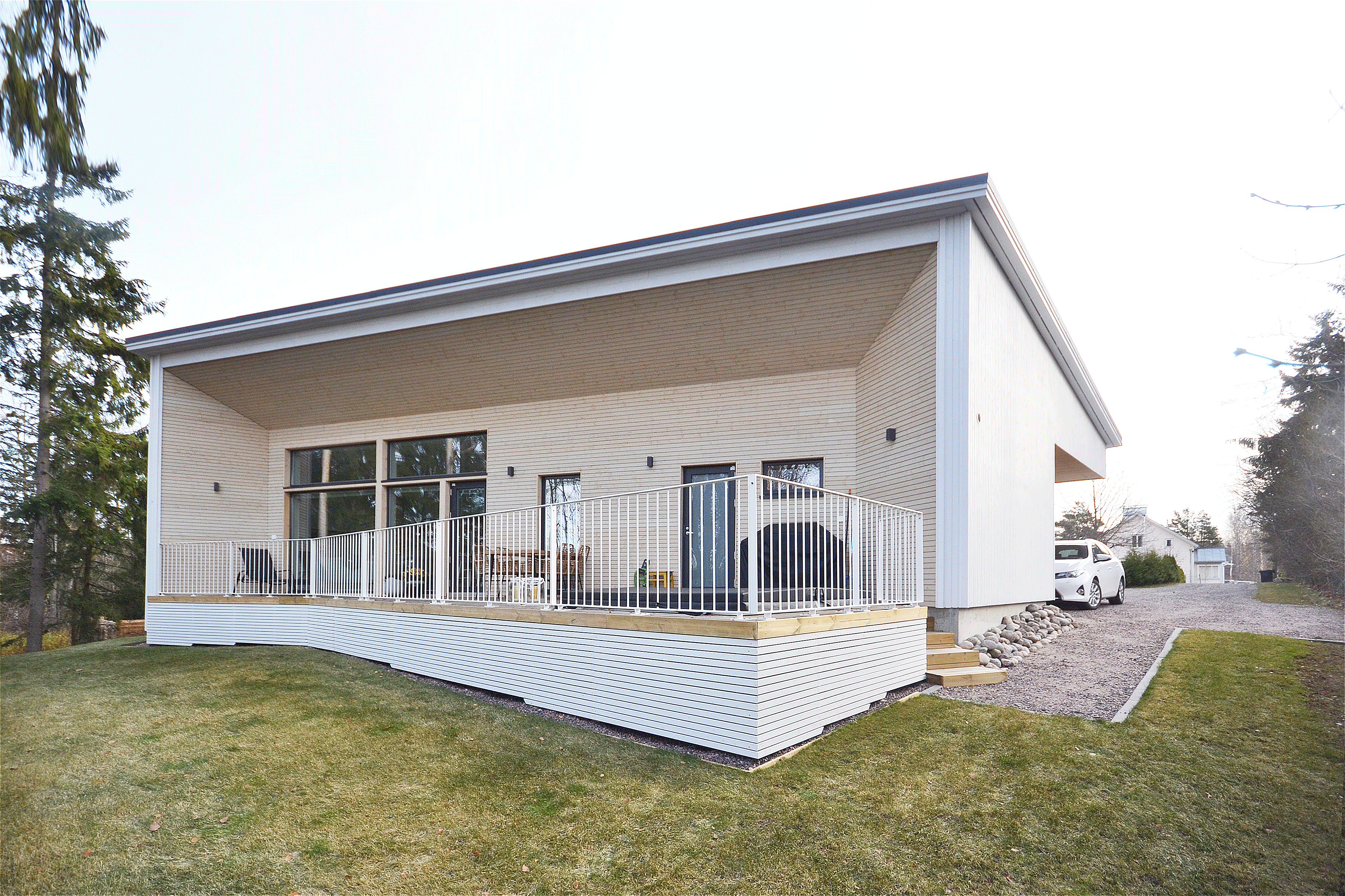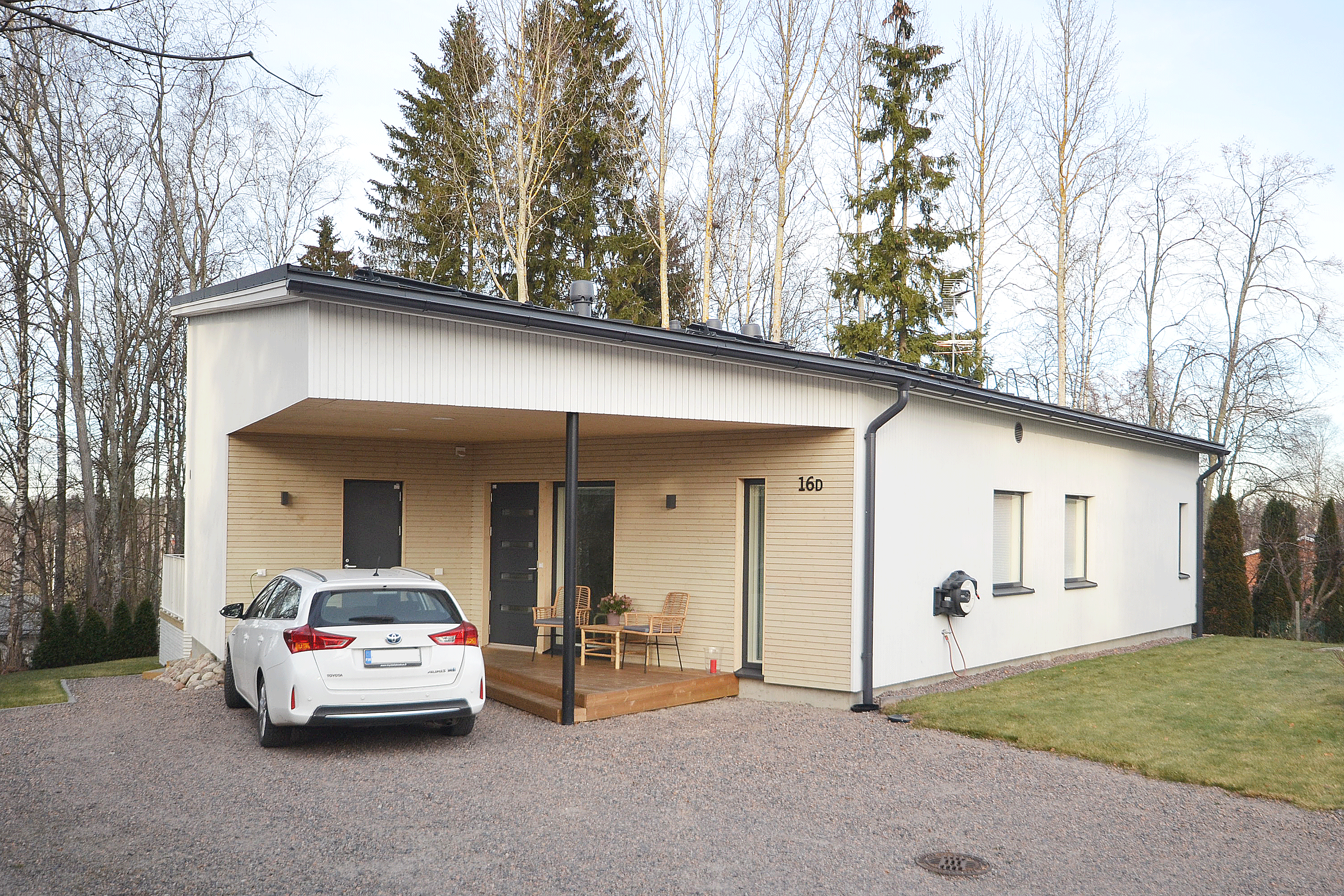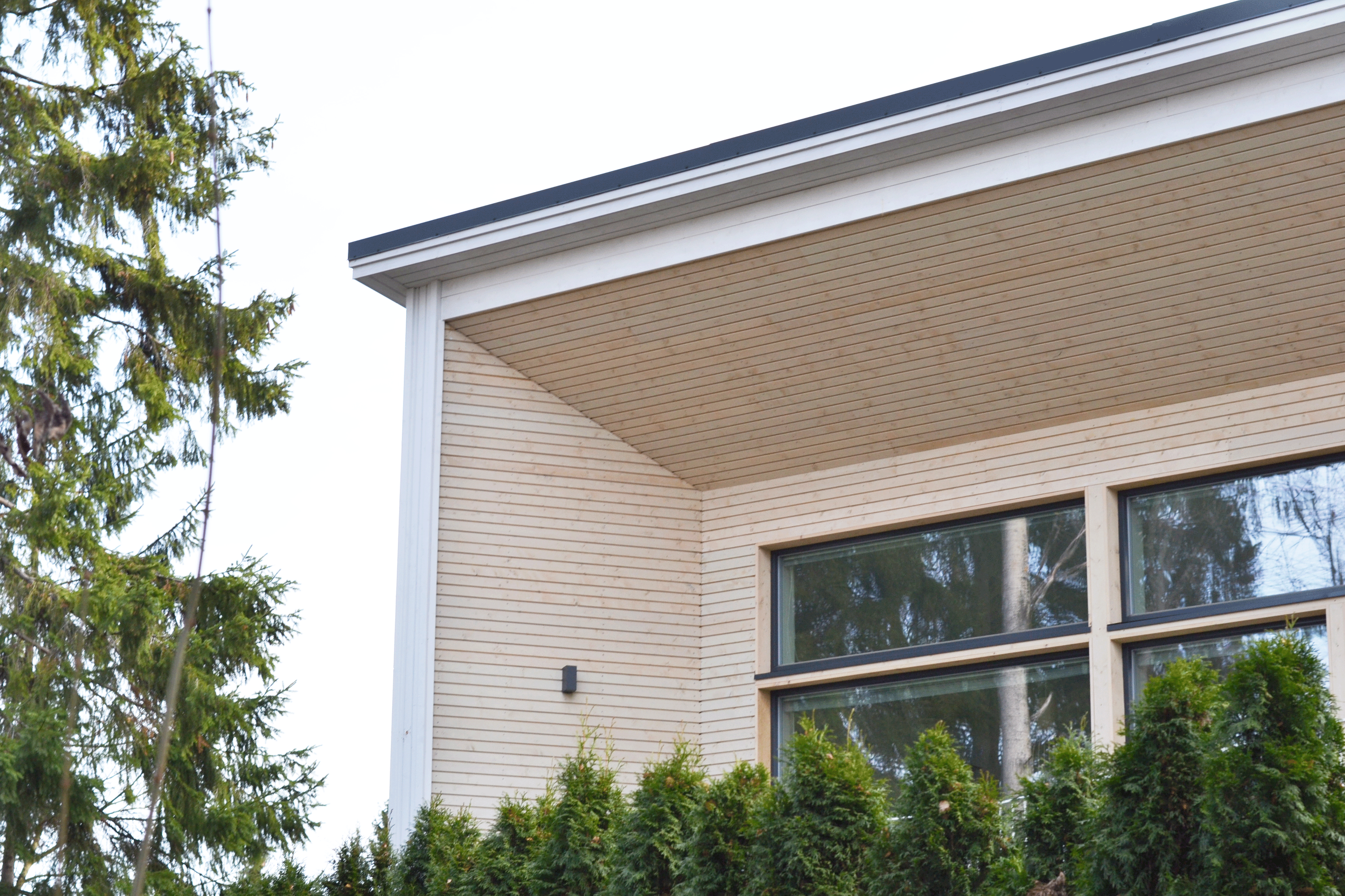 Compact single family house as a complementary building project between existing house and a municipal park. Wood constructed house has a long views towards forest.