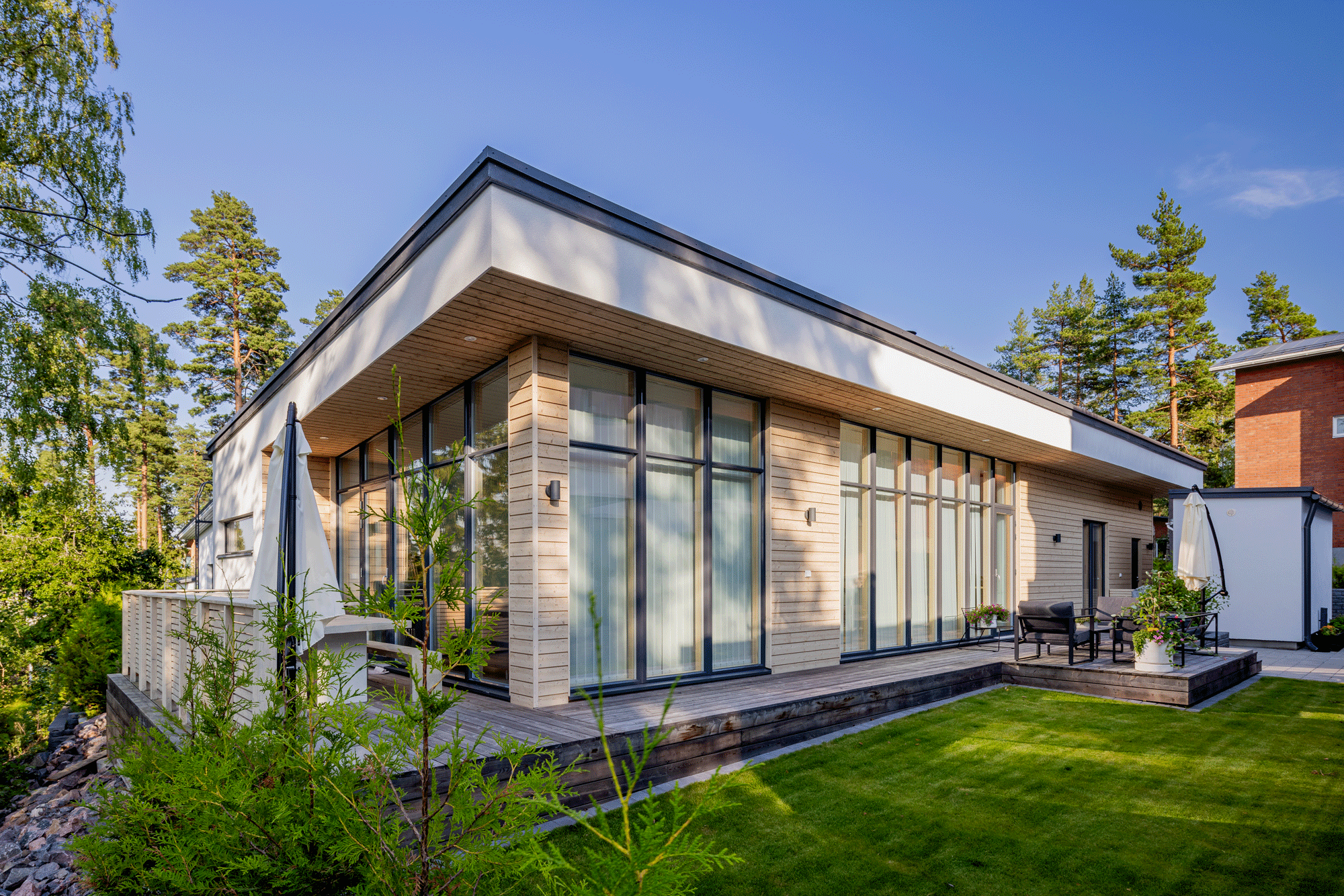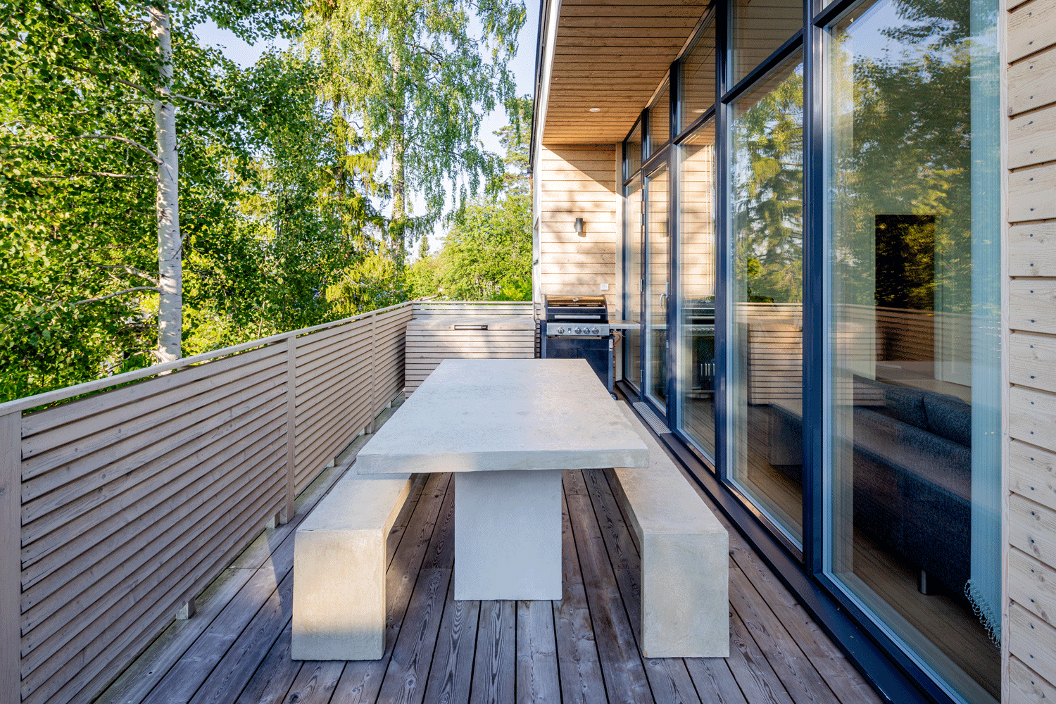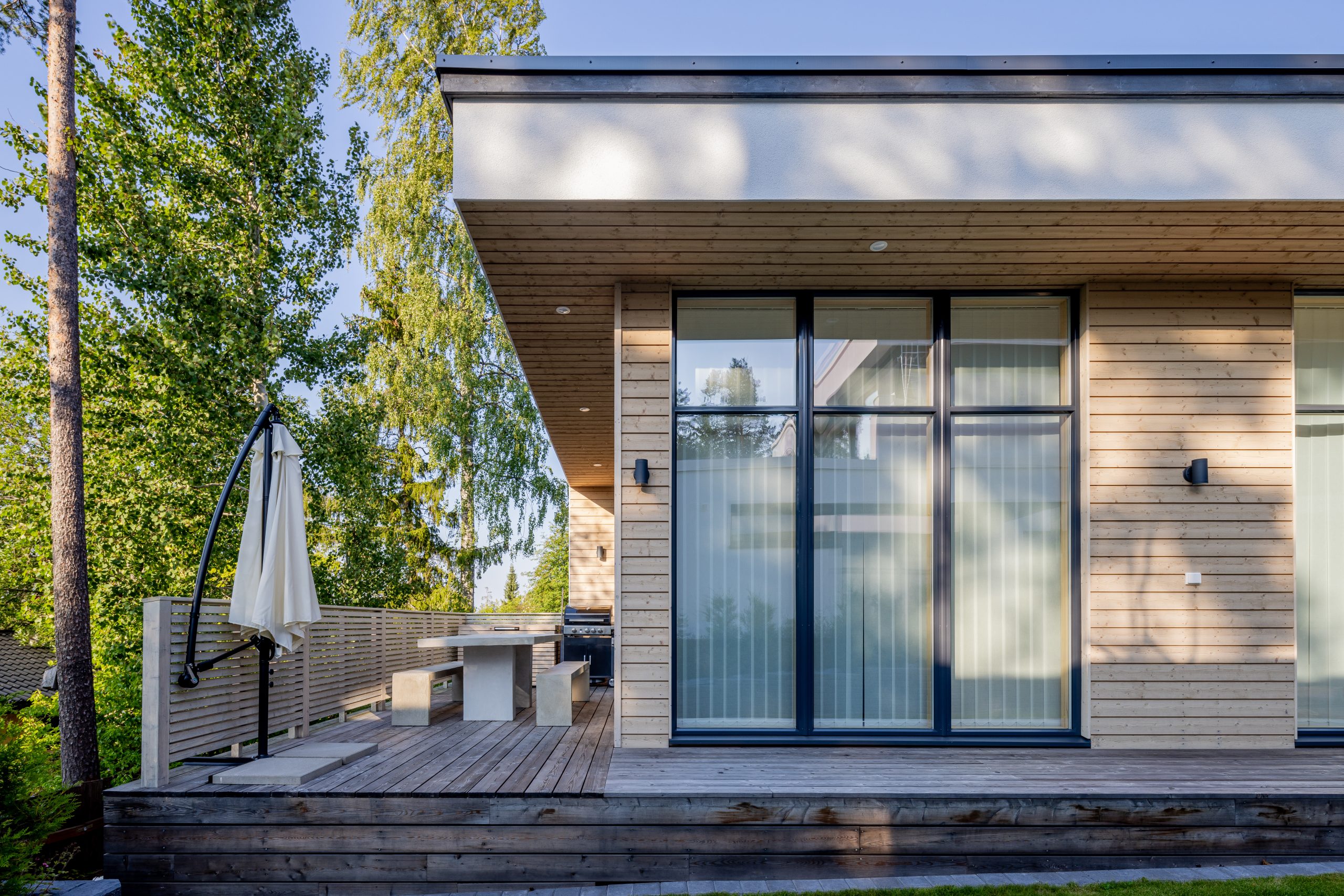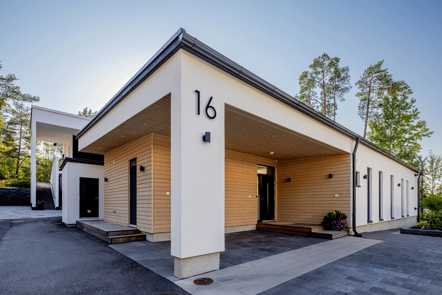 The building is situated in a calm residential area with terraces in two directions to catch both morning and evening sun. The house is being built in wood with a back side of white plastered facades and wooden facades towards the more private sides.