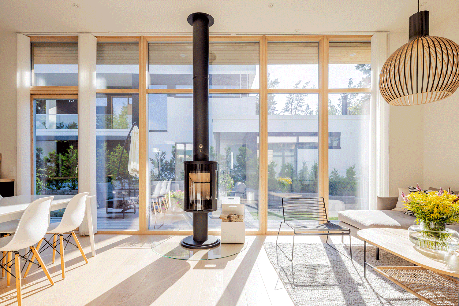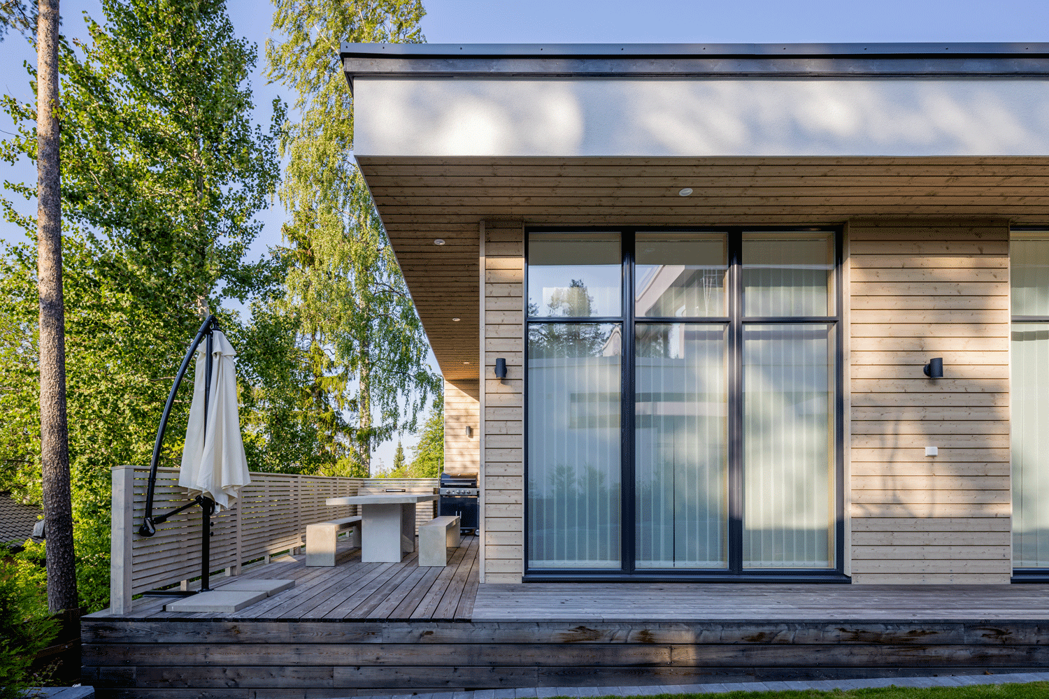 Rakennus sijaitsee rauhallisella asuinalueella. Terassit sijoittuvat rakennuksen kylkeen kahteen eri suuntaan, jotta sekä aamu- että ilta-auringosta nautiskelu on pihalla mahdollista. Puurakenteisen talon julkisivut ovat sisäänkäynnin puolelta rapattu valkoisiksi, kun taas suojaisalta ja yksityiseltä puoleltaan ne ovat lämpimän puunsävyiset.