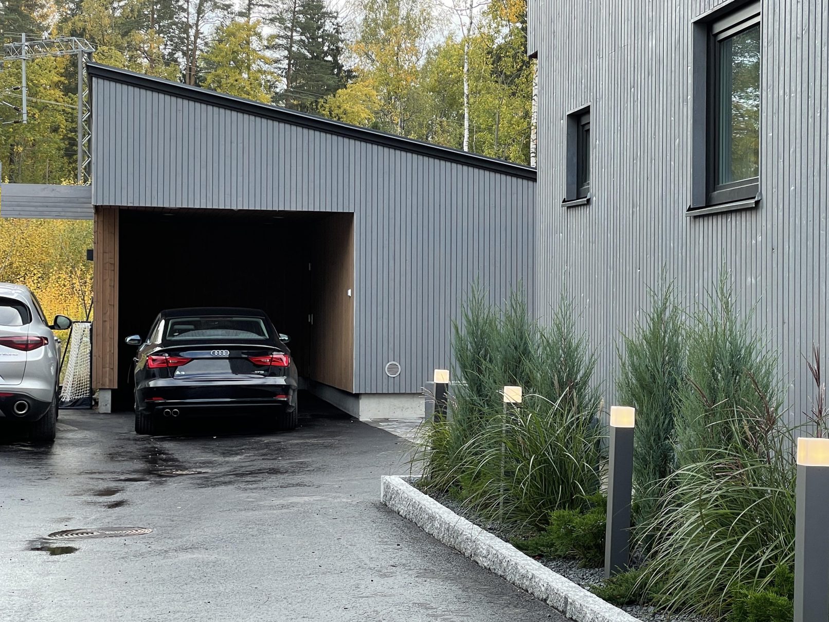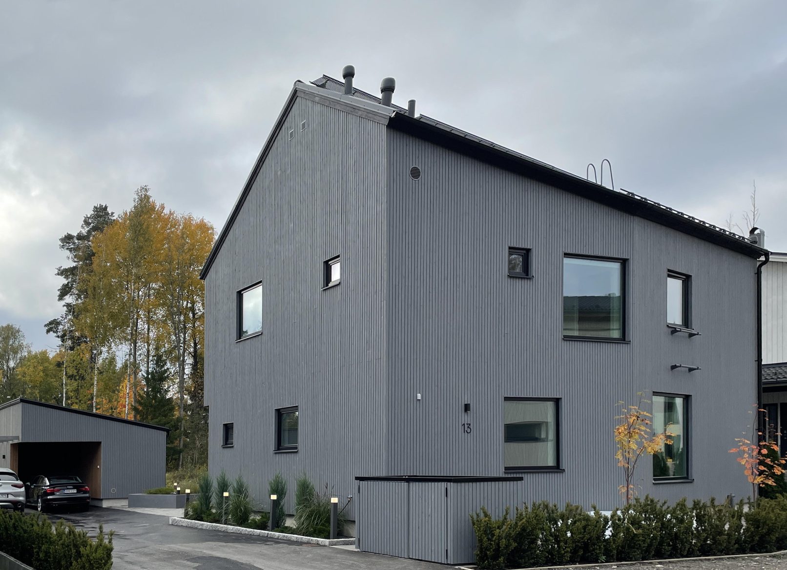 Puurakenteisen talon julkisivut ovat kuultokäsitelty niin että puun kaunis väri ja tuntu säilyvät luonteeenomaisina. Lämmin puu yhdistettynä linjakkaaseen tiilikattoon on estetiikaltaan moderni klassikko.