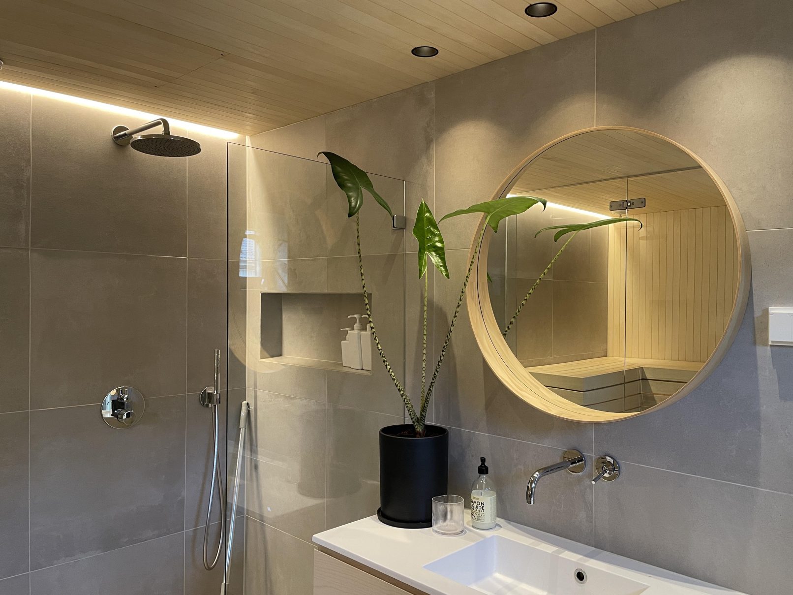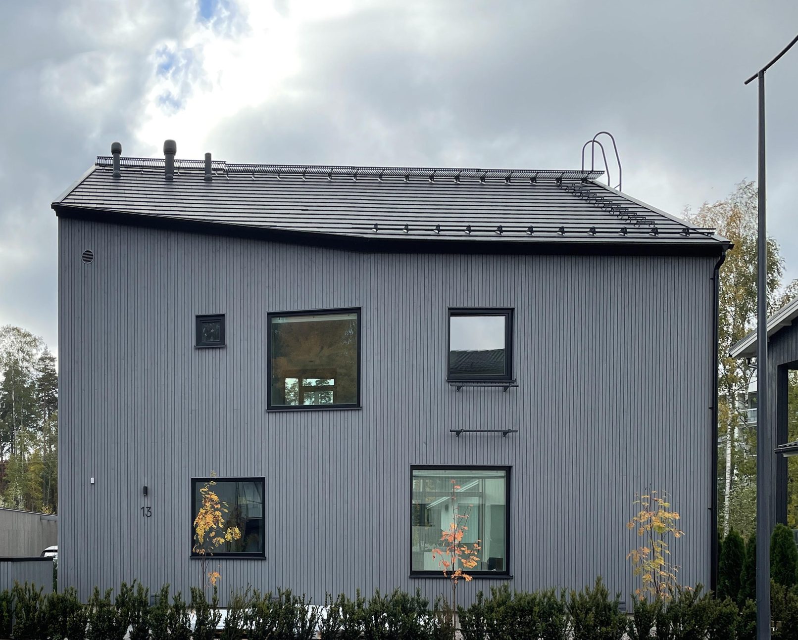 De personliga träfasaderna är behandlade med trälasyrfärg som framhäver träets naturliga karaktär. Taket har takplattor i mörkt taktegel.